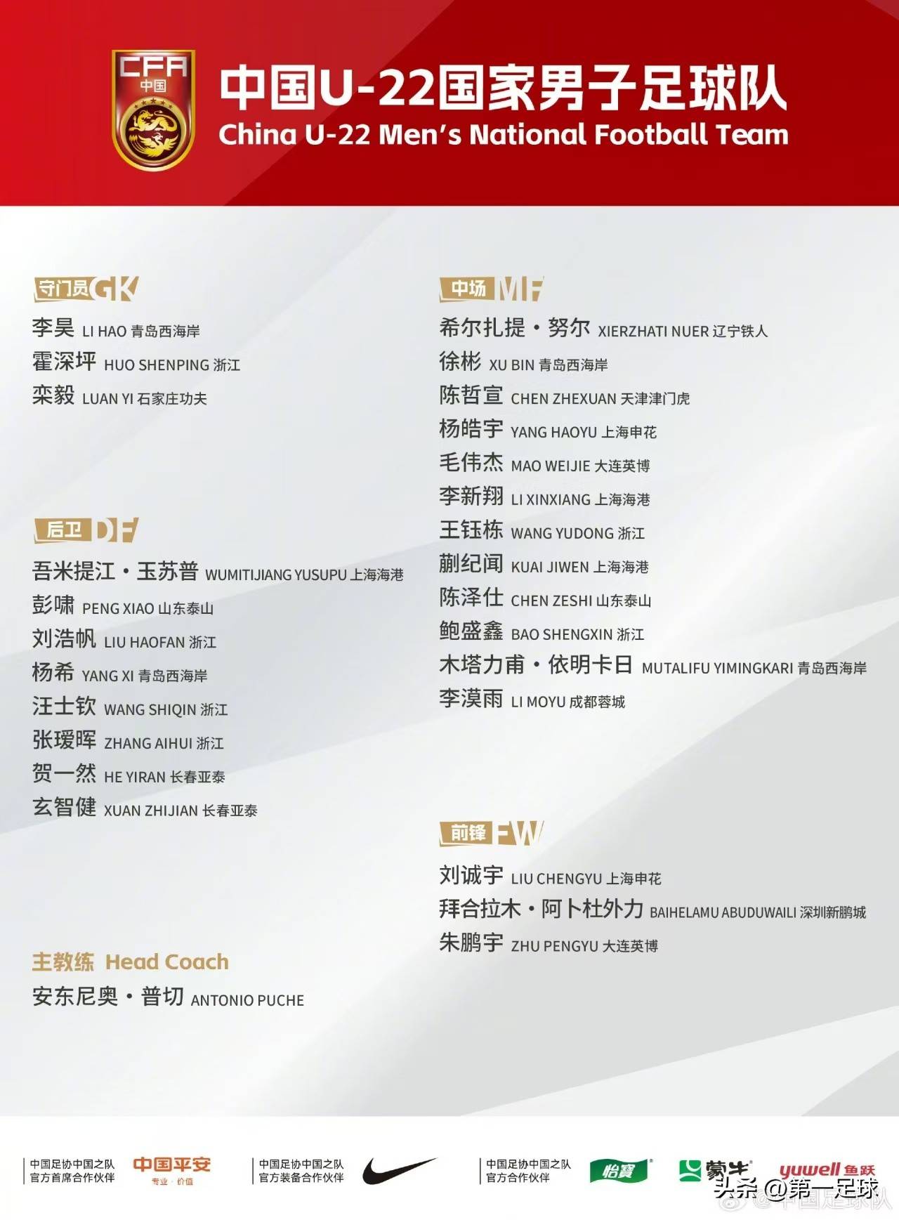 这一论点,在业内已基本获得广泛认同。本届U23亚洲杯的参赛球员年龄限制为2003年之后出生,并吸纳了部分05后更年轻的球员。根据近期公布的集训名单,我们得以一窥这支中国U23队的最新阵容。