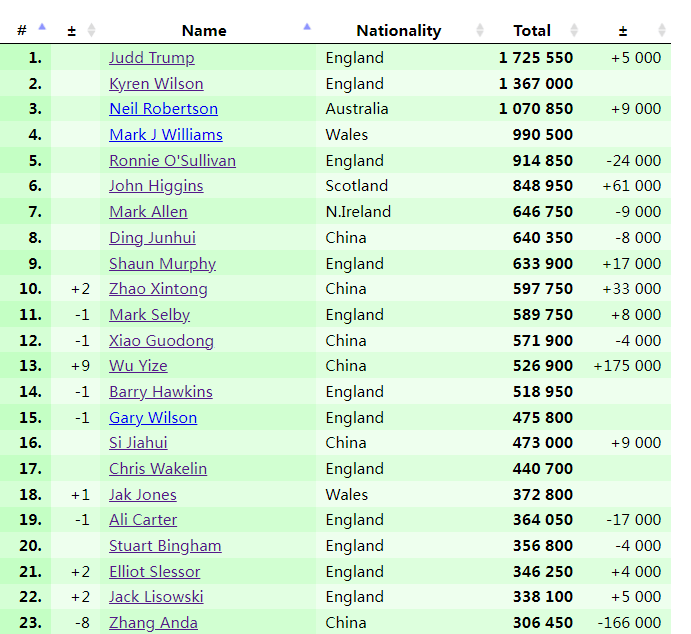 这个冠军,也为吴宜泽带来了17.5万英镑的冠军奖金积分,使得他的世界排名从赛前的地22位,飙升至第13位。最新的世界排名排名榜上,前九位没有变化,特鲁姆普依旧第1,奥沙利文第5,希金斯第6,丁俊晖第8。略有遗憾的是,张安达扣除两年前的国锦赛冠军积分后,排名跌至第23位。返回搜狐,查看更多