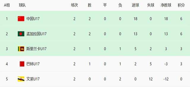 两轮比赛过后,A组的积分榜上,中国队与孟加拉国同积6分,但凭借着18个净胜球的优势,中国队暂居小组头名,孟加拉国则以13个净胜球紧随其后。斯里兰卡和巴林同积3分,但净胜球差距较大,而文莱和东帝汶两战皆墨,出线希望渺茫。