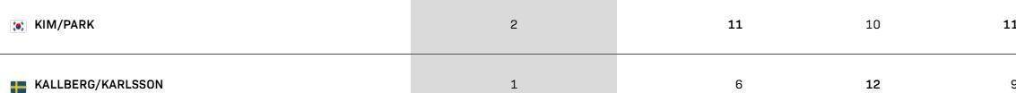 这场被认为瑞典队最有希望拿分的对决却出现一边倒的局面,韩国组合发动迅猛,首局以11-2的悬殊比分轻松拿下。 第二局瑞典组合状态略有回升,但仍难以抵挡韩国队的攻势,最终以7-11再丢一局。