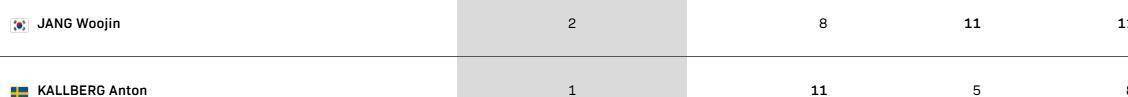 第三盘男单对决,韩国张禹珍对阵瑞典安东·卡尔伯格。 张禹珍先以8-11丢失首局,但随后以11-5、11-8逆转取胜,将韩国队总比分扩大至6-3。