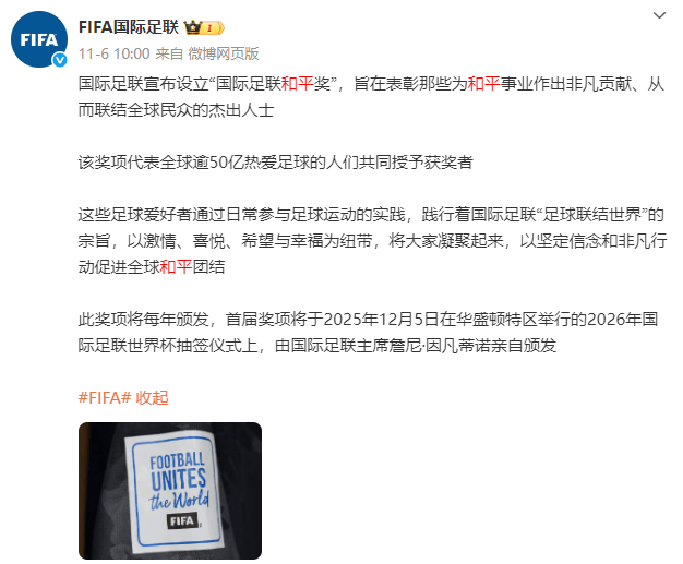 此前据FIFA国际足联,世界杯抽签仪式上,国际足联主席因凡蒂诺将亲自颁发首届“国际足联和平奖”。据介绍,国际足联宣布设立“国际足联和平奖”,旨在表彰那些为和平事业作出非凡贡献、从而联结全球民众的杰出人士,该奖项代表全球逾50亿热爱足球的人们共同授予获奖者,这些足球爱好者通过日常参与足球运动的实践,践行着国际足联“足球联结世界”的宗旨,以激情、喜悦、希望与幸福为纽带,将大家凝聚起来,以坚定信念和非凡行动促进全球和平团结,此奖项将每年颁发。