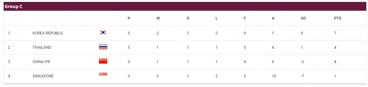 本场战罢,中国队3战一胜一平一负,与泰国同积4分,因净胜球劣势排名小组第3位。北京时间3月26日,国足将回到主场与新加坡进行二番战。