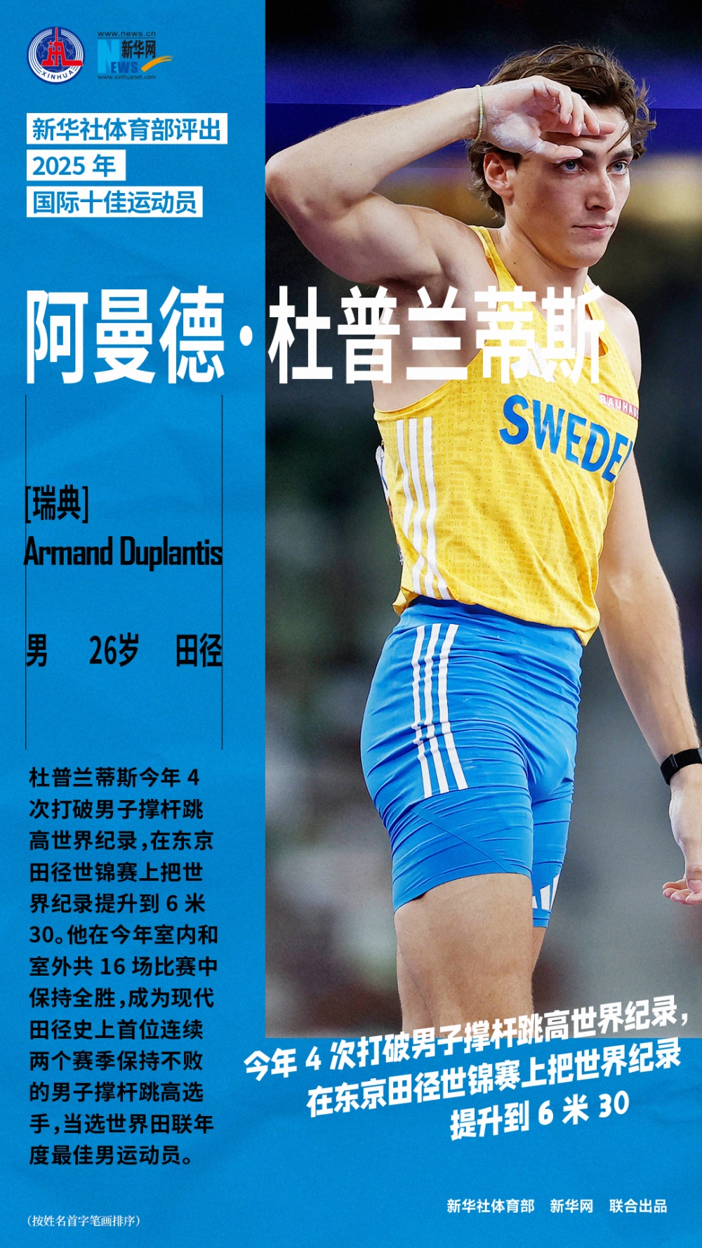 杜普兰蒂斯今年4次打破男子撑杆跳高世界纪录,在东京田径世锦赛上把世界纪录提升到6米30。他在今年室内和室外共16场比赛中保持全胜,成为现代田径史上首位连续两个赛季保持不败的男子撑杆跳高选手,当选世界田联年度最佳男运动员。
