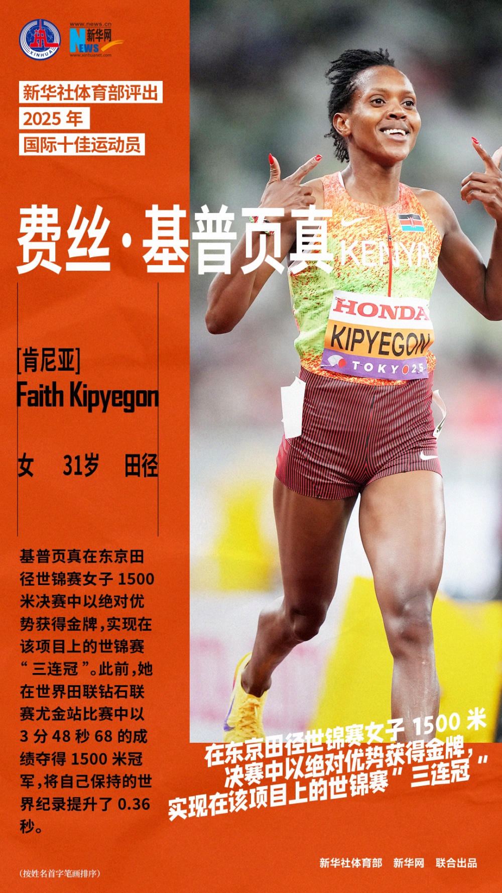 基普页线米决赛中以绝对优势获得金牌,实现在该项目上的世锦赛“三连冠”。此前,她在世界田联钻石联赛尤金站比赛中以3分48秒68的成绩夺得1500米冠军,将自己保持的世界纪录提升了0.36秒。