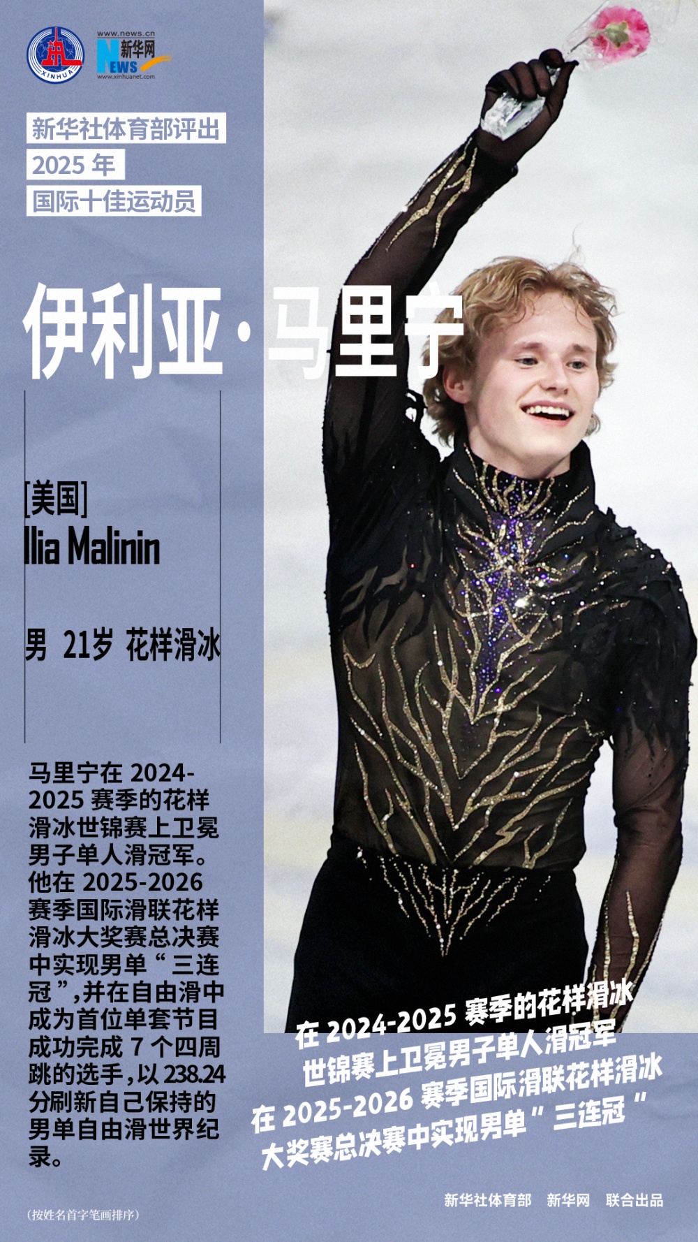 马里宁在2024-2025赛季的花样滑冰世锦赛上卫冕男子单人滑冠军。他在2025-2026赛季国际滑联花样滑冰大奖赛总决赛中实现男单“三连冠”,并在自由滑中成为首位单套节目成功完成7个四周跳的选手,以238.24分刷新自己保持的男单自由滑世界纪录。