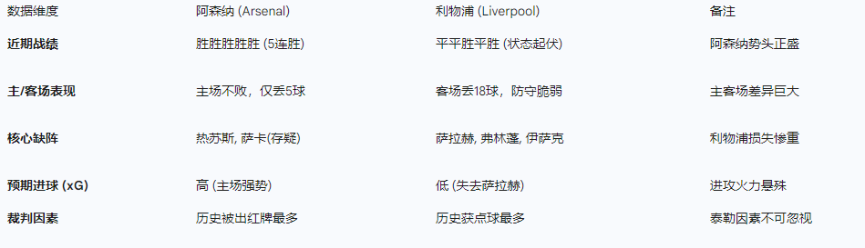 :阿森纳全队士气高涨,刚经历两场连胜(3-2伯恩茅斯,4-1阿斯顿维拉);而利物浦则在舆论的批评声中挣扎,且面临着极其严重的“伤病+国家队征召”双重打击。